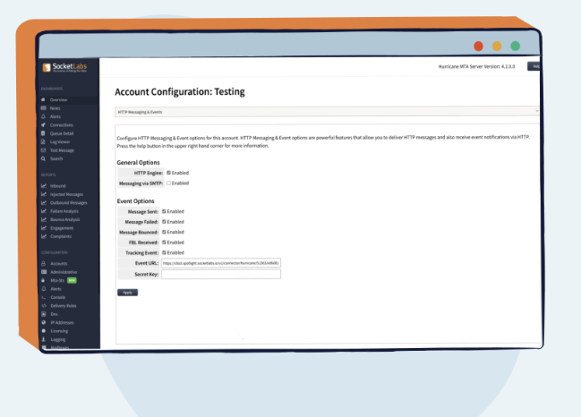 - Check the HTTP Engine option to enable. Paste your Endpoint URL in the text box labeled Event URL. Check the below event types, then click apply.